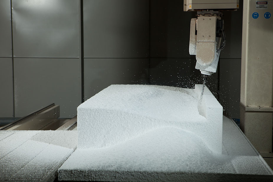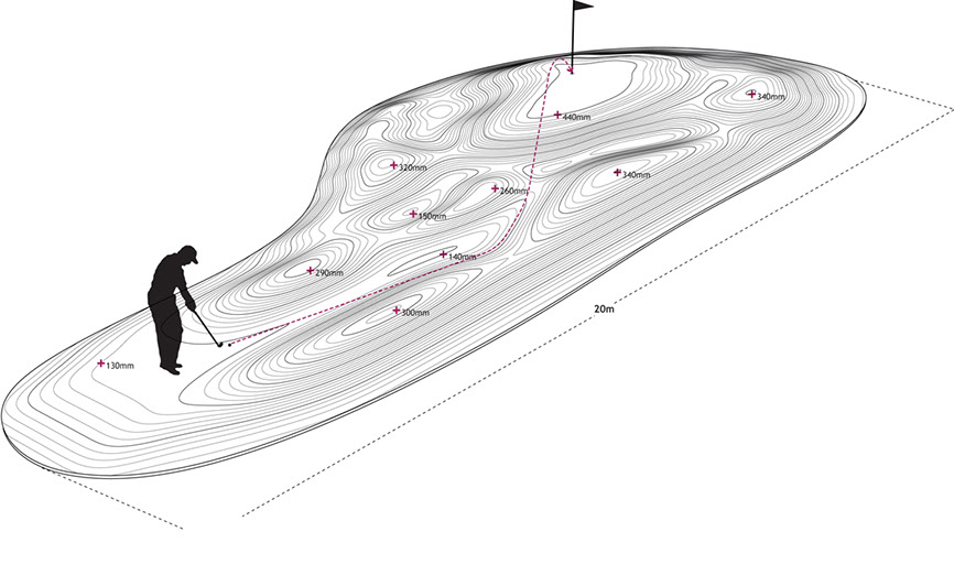 The putting green body was milled using a CNC router out of 17 blocks of polystyrene foam. This high-tech tooling allowed for a continuous surface to be seamlessly assembled on site with minimal adjustment.