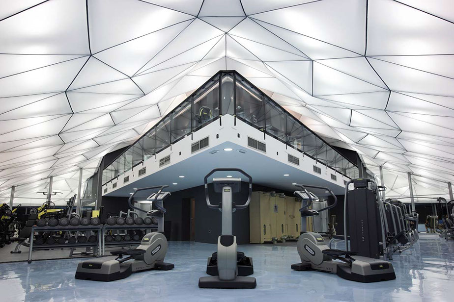 We have defined the Sky Wellness concept suggesting that place should be light and spacious so that visitors should be getting an impression of entering a cloud on arrival. In response we have opted for reflective resin floor finishes throughout and semi translucent stretched ceiling.