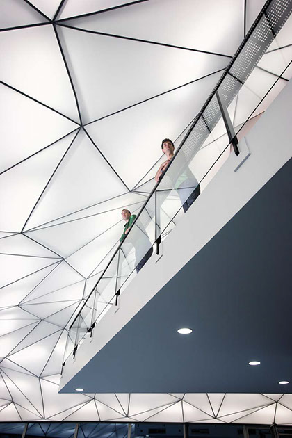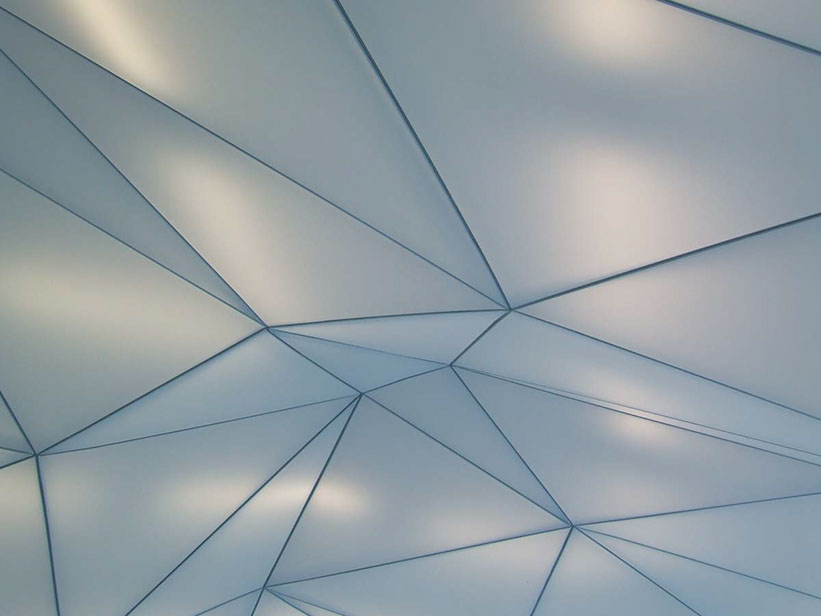 Defining moment of the new spatial expression is the ceiling. Its design is the sequence of geometric transformations and subdivision applied to the original grid. As a result, approximately 390 backlit panels with the finite variation in shape and size are suspended from the triangular steel construction.